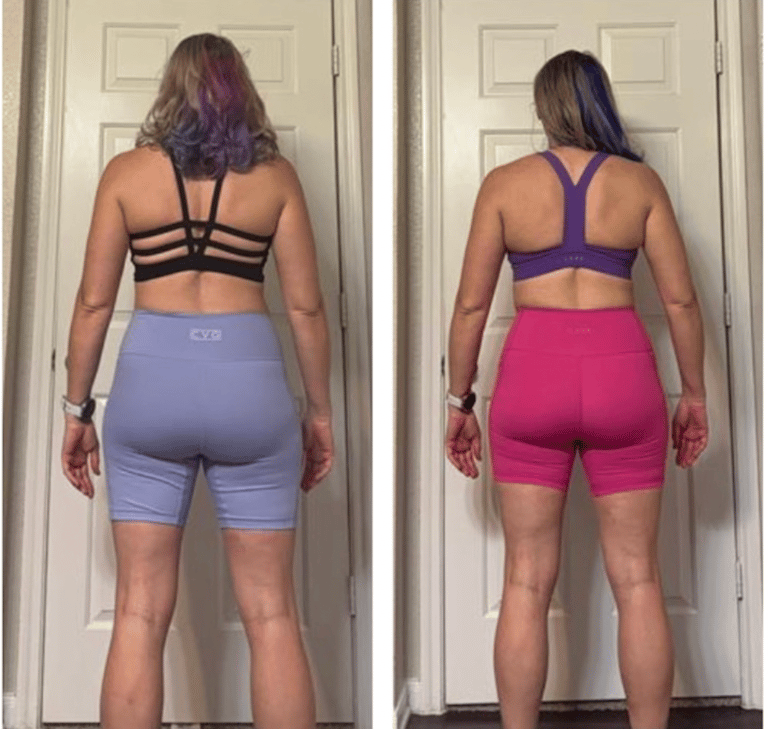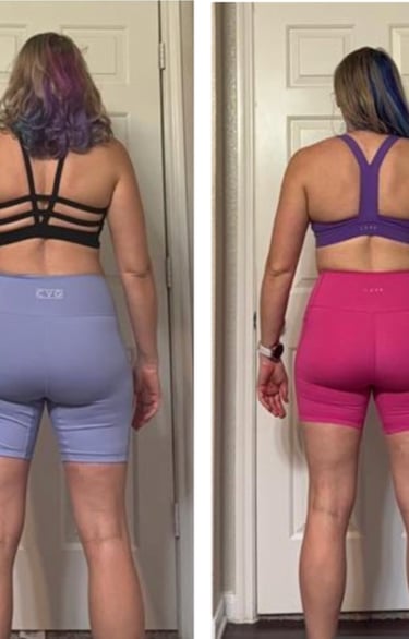 "195lbs weigh in & also feeling stronger. It's officially been a year of training & seeing the body composition differences is wild!! Ordered a new lifting belt a size smaller since the old one was too big" - Maddie C